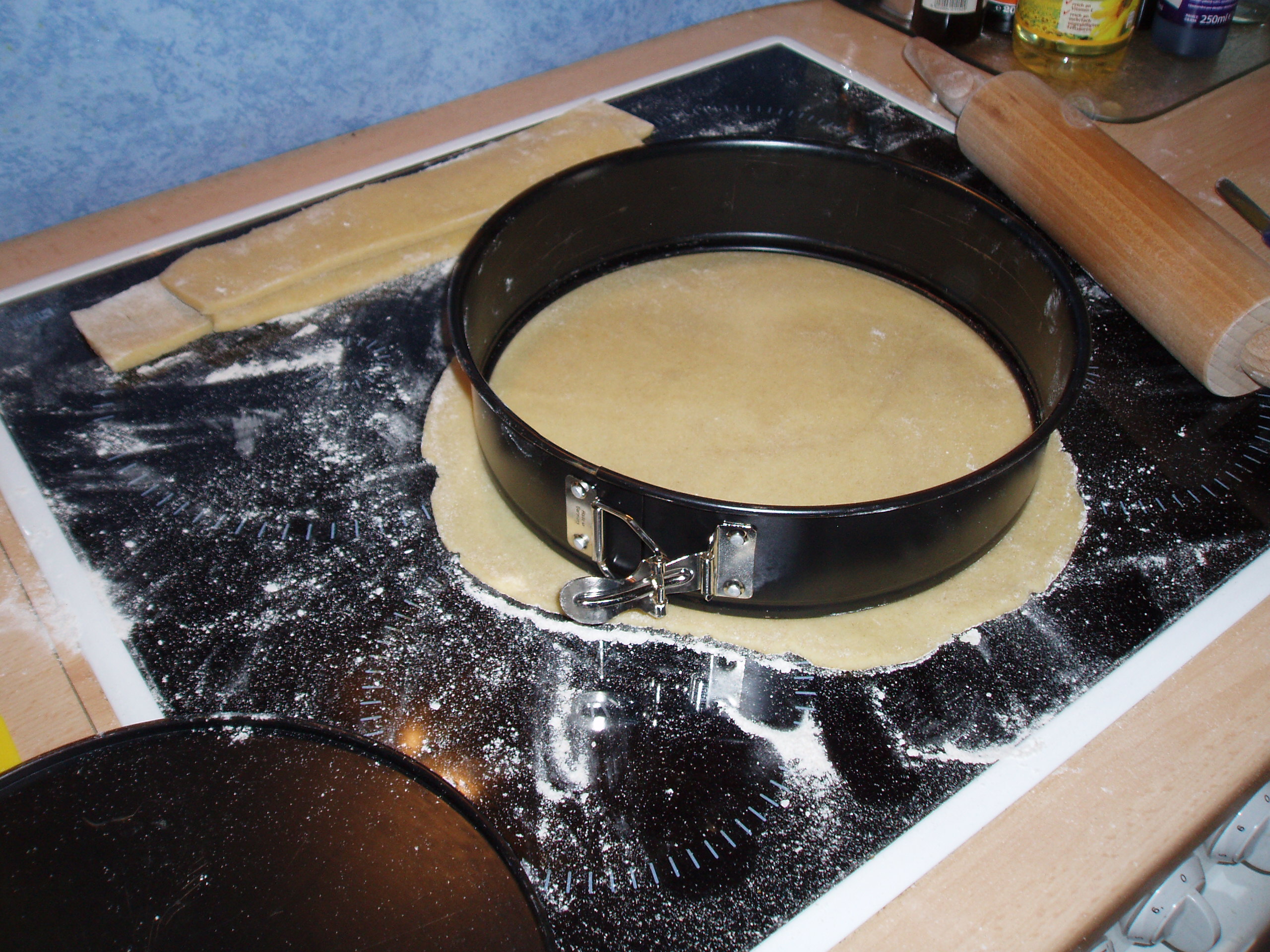 Die zwei größeren werden auf etwa einen halben Zentimeter dick und auf die Größe der Springform ausgerollt. Die Springform wird dabei als Schablone benutzt, um den Teig zurechtzuschneiden.