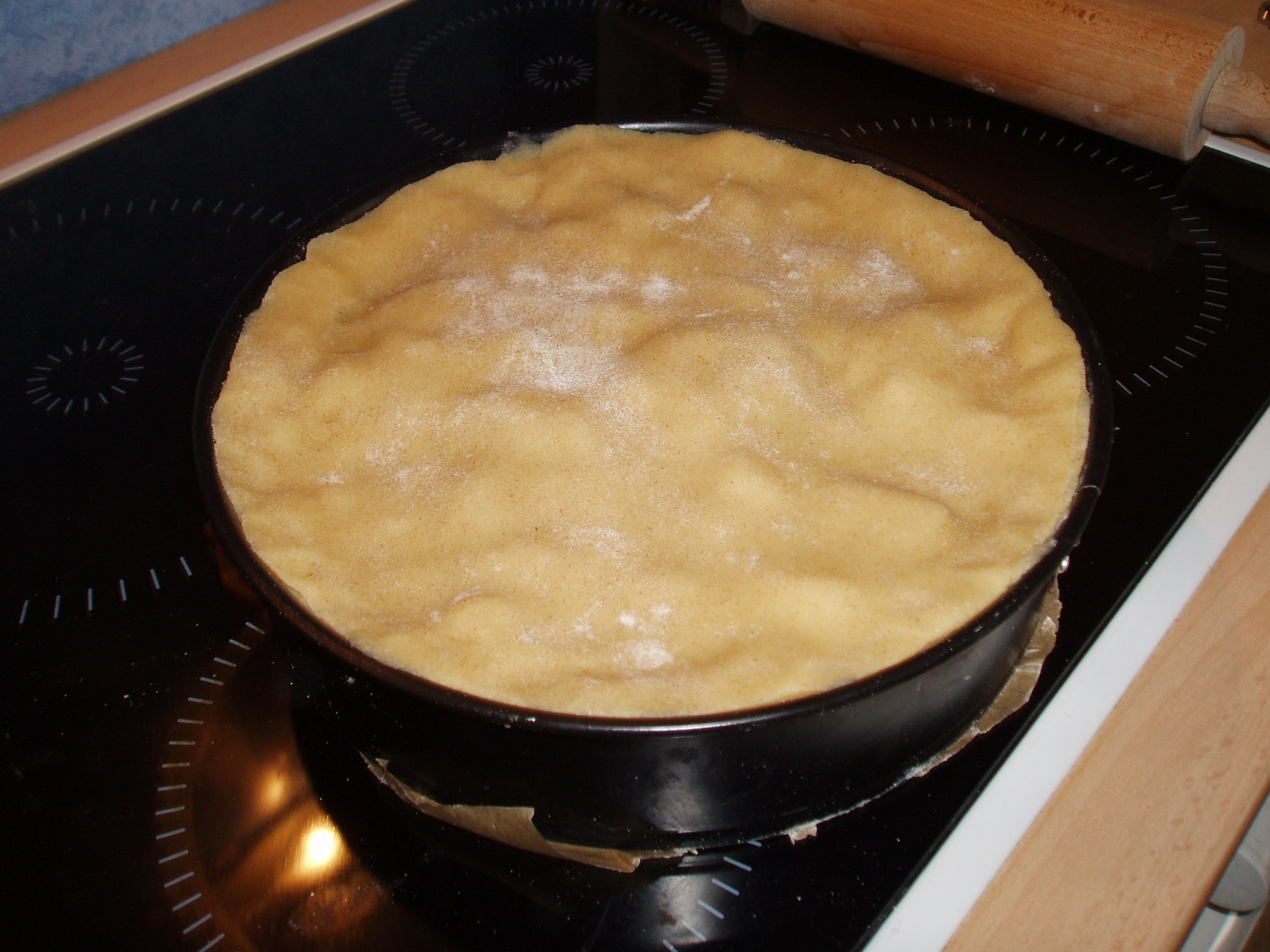 Das Gleiche wird mit dem kleineren Stück Teig gemacht. Ausrollen und auf die Größe des Springformrands zuschneiden, dabei dürfen auch mehrere kleine Stücke aneinandergereiht werden.
