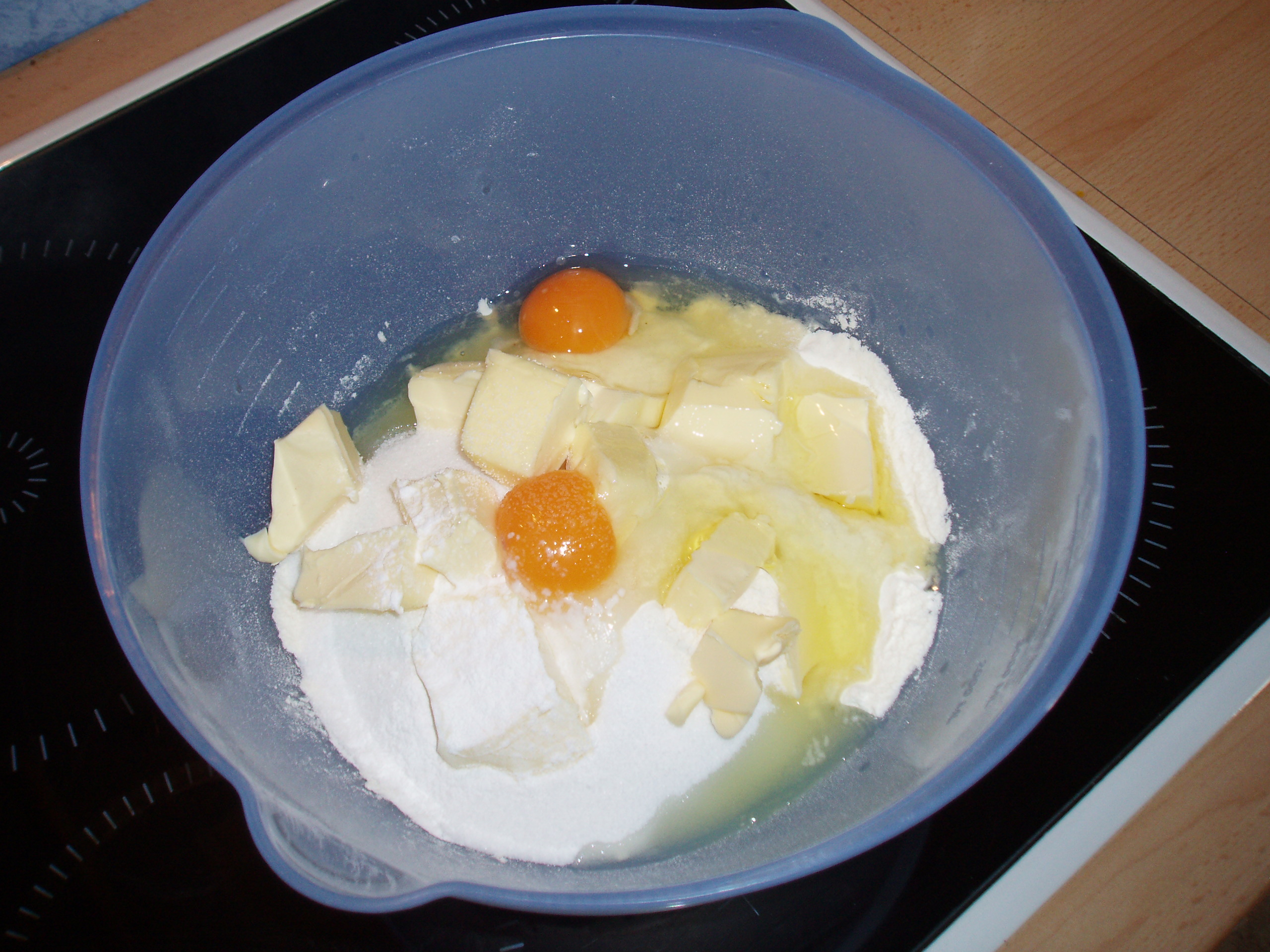 Das Mehl mit Zucker, Butter, Eiern und Salz und Backpulver mischen und mit der Hand verkneten.